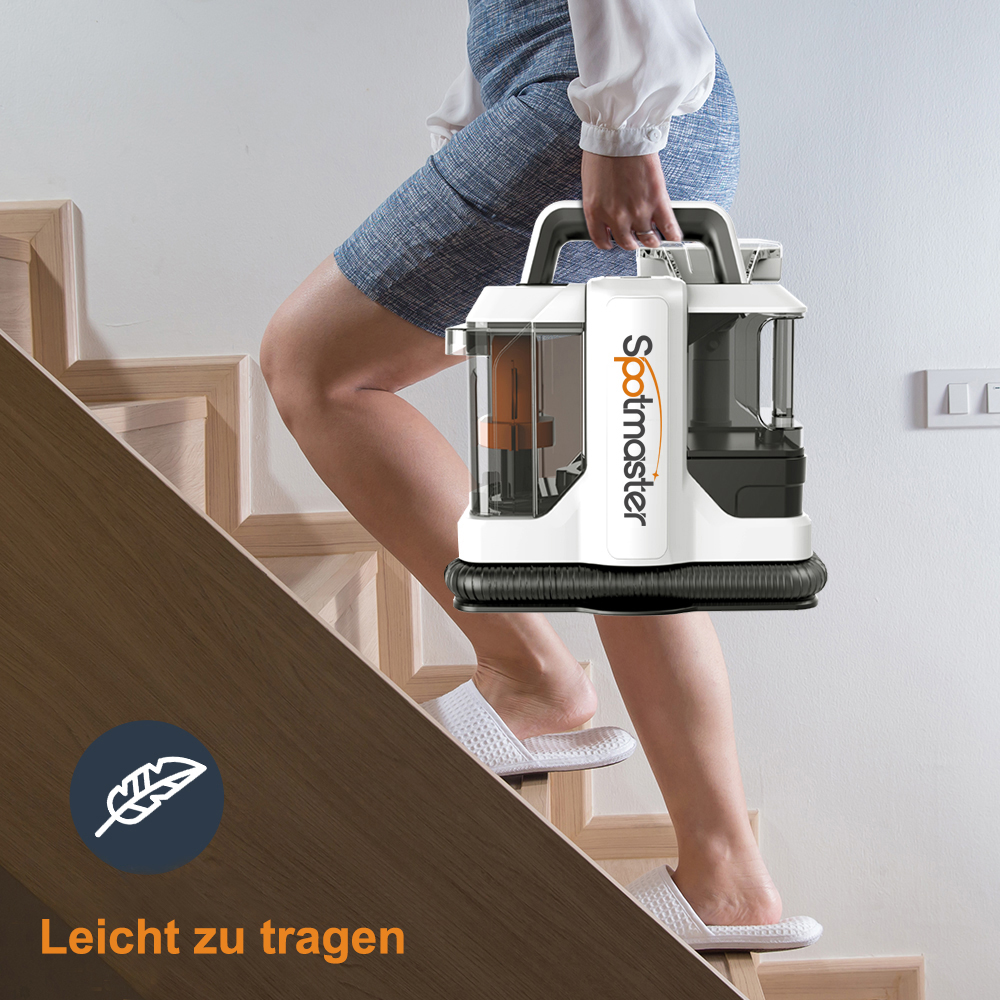 Der Spotmaster Teppichreiniger wiegt nur 4,5 Kilogramm, ist leicht und handlich, was eine einfache Bedienung und Transport mit einer Hand ermöglicht. Das leichte Design reduziert nicht nur die Belastung bei der Nutzung, sondern erhöht auch die Flexibilität, sodass der Reinigungsprozess müheloser und effizienter wird. Besonders geeignet ist das Gerät für den Einsatz im Haushalt und in verschiedenen Anwendungsbereichen.